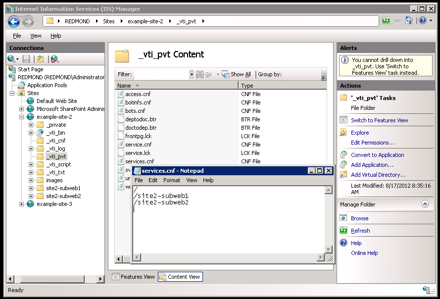 Example of 2 subwebs listed in the site example-site-2 services.cnf file